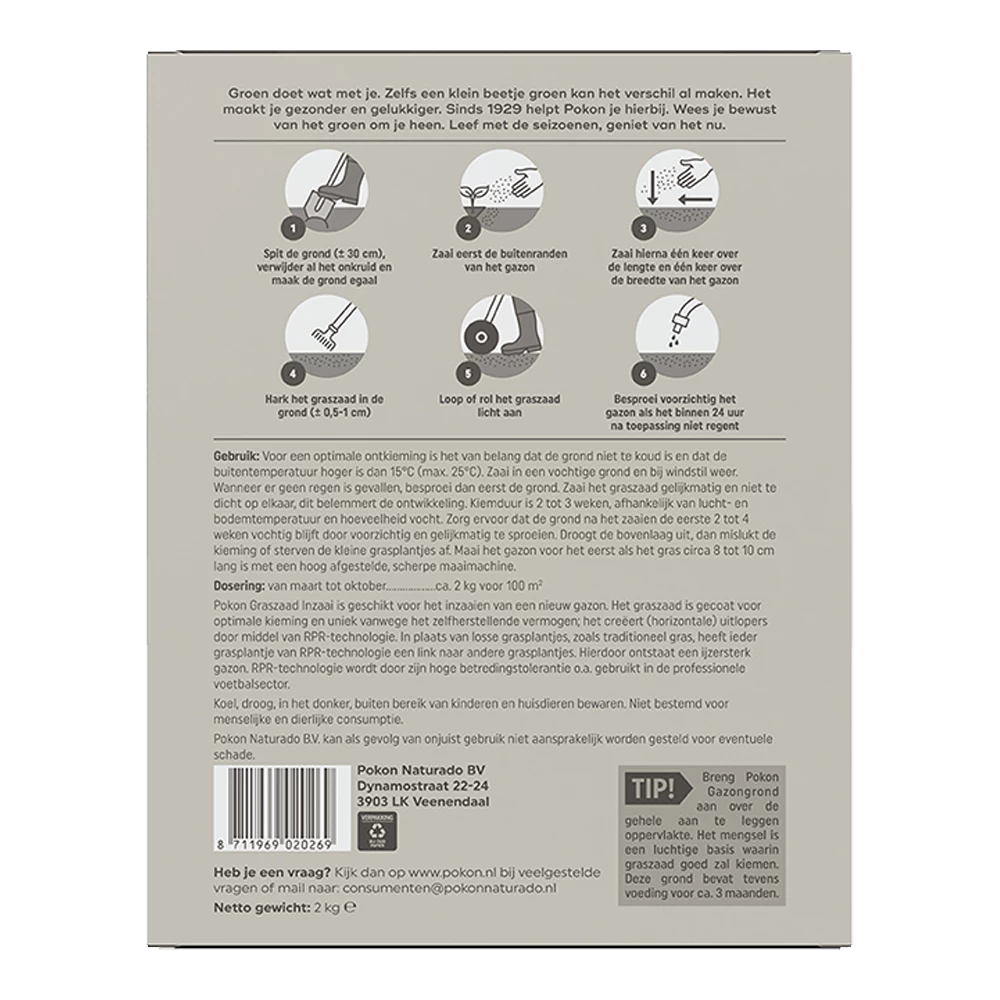 Pokon Graszaad Inzaai is geschikt voor het inzaaien van een nieuw gazon. Het graszaad is gecoat voor optimale kieming en uniek vanwege het zelfherstellende vermogen; het creëert (horizontale) uitlopers door middel van RPR-technologie. In plaats van losse grasplantjes, zoals traditioneel gras, heeft ieder grasplantje van RPR-technologie een link naar andere grasplantjes. Hierdoor ontstaat een ijzersterk gazon, RPR-technologie wordt door zijn betredingstolerantie o.a. gebruikt in de professionele voetbalsector. Voor een optimale ontkieming is het van belang dat de grond niet te koud is en dat de buitentemperatuur hoger is dan 15°C (max. 25°C). Zaai in een vochtige grond en bij windstil weer. Wanneer er geen regen is gevallen, besproei dan eerst de grond. Zaai het graszaad gelijkmatig en niet te dicht op elkaar, dit belemmert de ontwikkeling. Kiemduur is 2 tot 3 weken, afhankelijk van lucht- en bodemtemperatuur en hoeveelheid vocht. Zorg ervoor dat de grond na het zaaien de eerste 2 tot 4 weken vochtig blijft door voorzichtig en gelijkmatig te sproeien. Droogt de bovenlaag uit, dan mislukt de kieming of sterven de kleine grasplantjes af. Maai het gazon voor het eerst als het gras circa 8 tot 10 cm lang is met een hoog afgestelde, scherpe maaimachine.