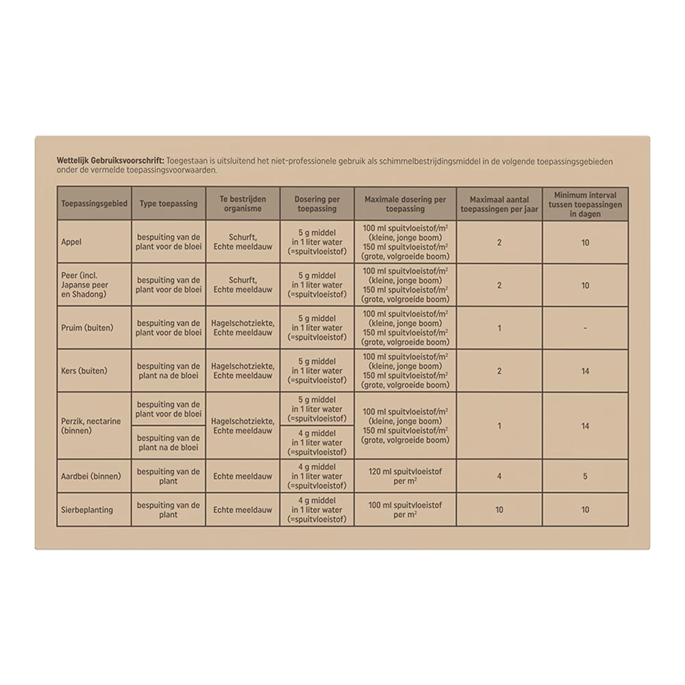 | Dosis | 4/5g middel in 1L water (=spuitvloeistof) |