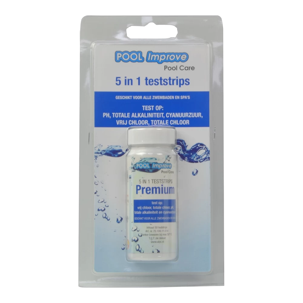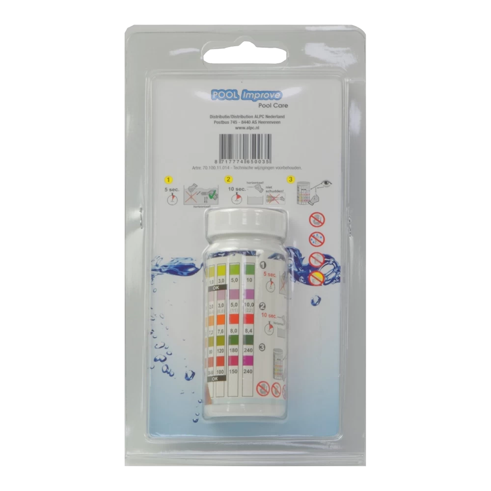 Strips voor het testen van zwembadwater. Eenvoudig het teststripje onder water dompelen en de kleuren vergelijken. 5 in 1: meet vrij chloor, totaal chloor, pH waarde, alkaliteit en cyanuurzuur. 50 teststrips per verpakking, per 10 stuks verpakt in aluminiumfolie voor betere testresultaten. Voor gebruik de gebruiksaanwijzing aandachtig doorlezen.