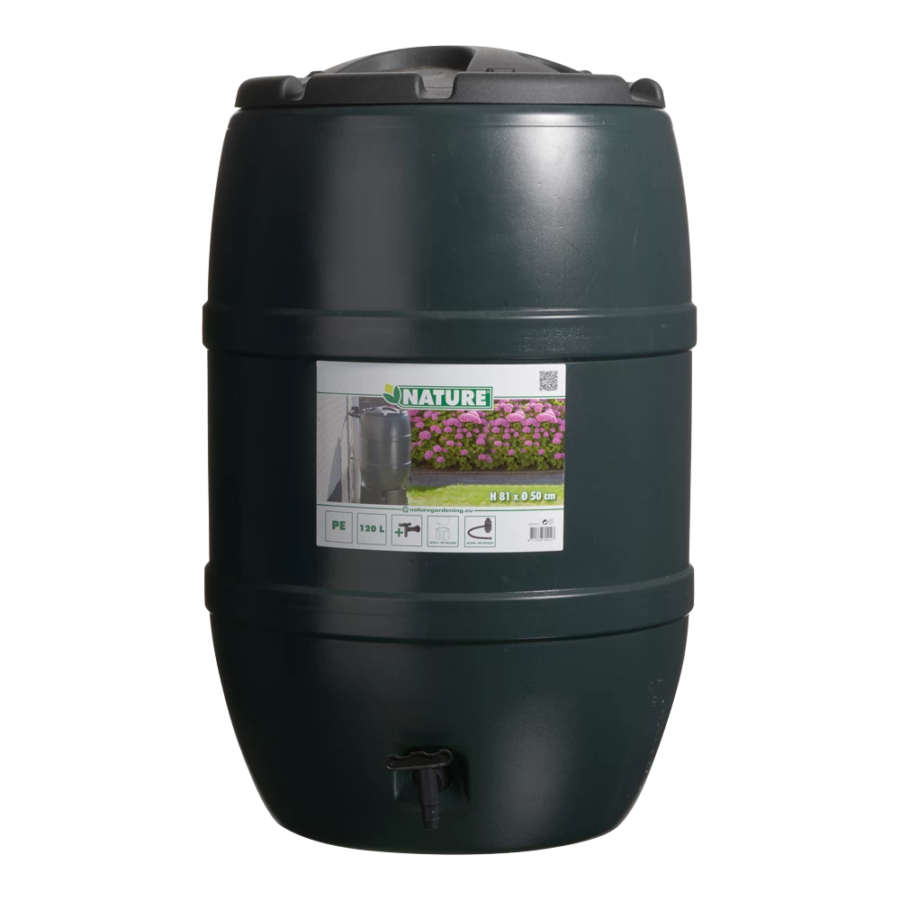 Kunststof regenton 120 L gemaakt van uv-bestendig, groen polyethyleen. Bevat een kraan om makkelijk emmers en gieters te kunnen vullen. Afmeting: H 81 x Ø 50 cm, inhoud: 120 L.
