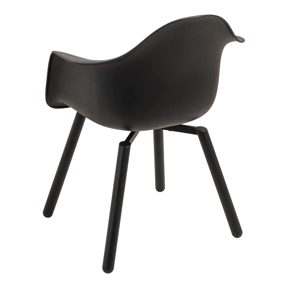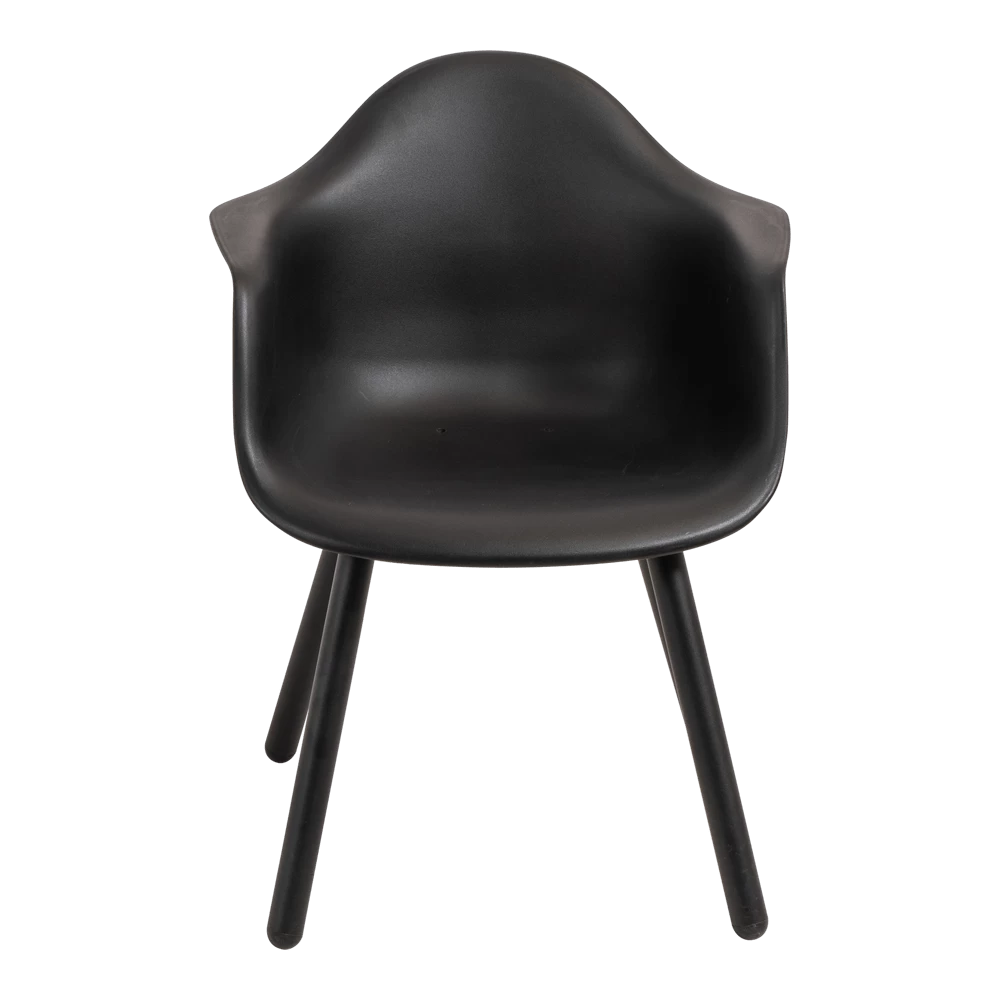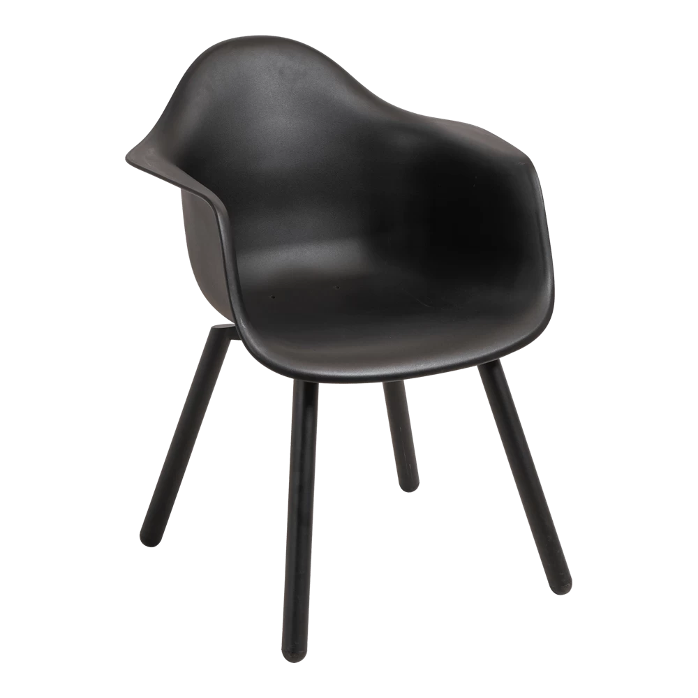 Het onderstel van de stoel heeft een zwarte coating, maar is vervaardigd uit aluminium. Hierdoor staat het niet alleen mooi, maar is de stoel ook onderhoudsvriendelijk! Het zitgedeelte is gemaakt van kunststof en bevat gaatjes voor de afvoer van (regen)water. Kunststof is sterk, onderhoudsarm en licht in gewicht. Beide materialen zijn zeer geschikt voor buiten.