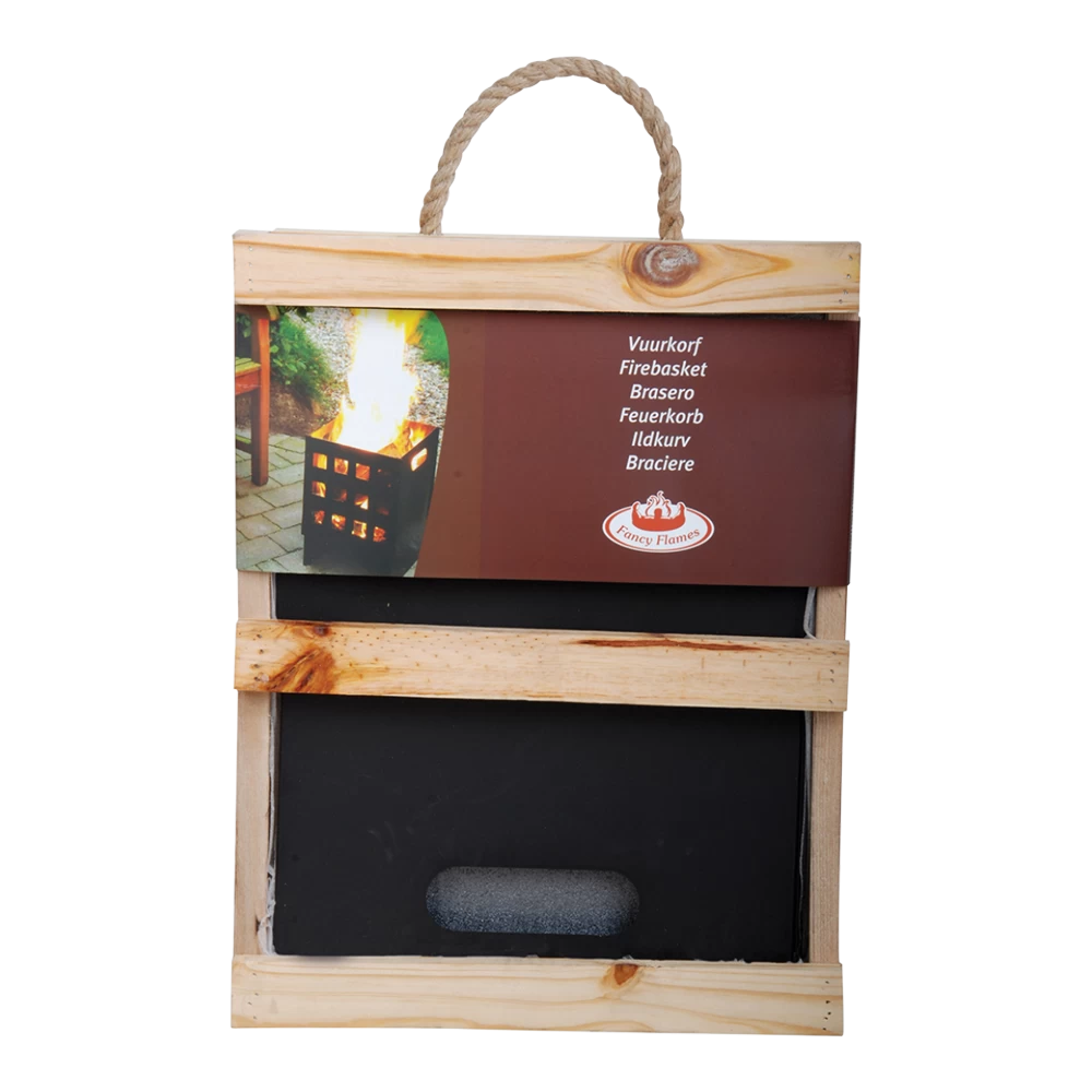 Less is more! Deze lage vierkante vuurkorf heeft een strakke uitstraling en past daardoor in iedere tuin. Bovendien is over de verpakking nagedacht, het houten krat met handvat is her te gebruiken als brandhout.