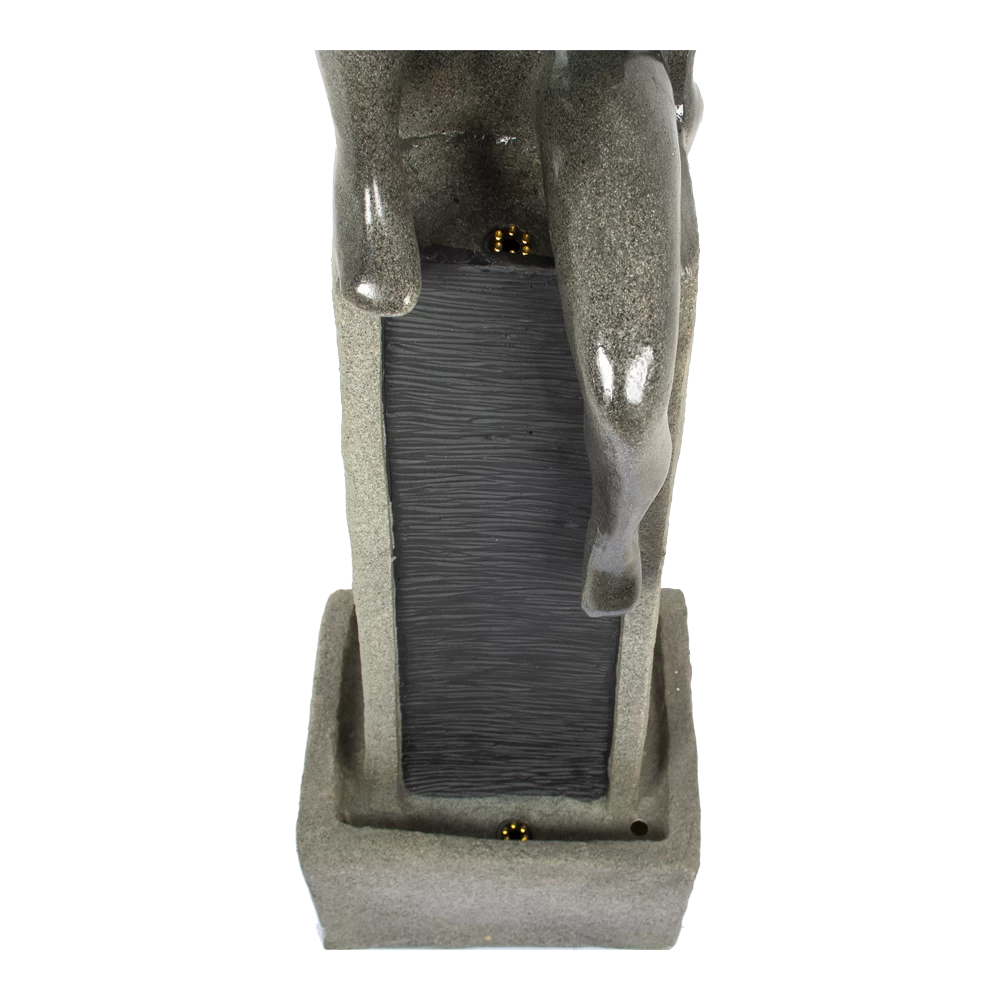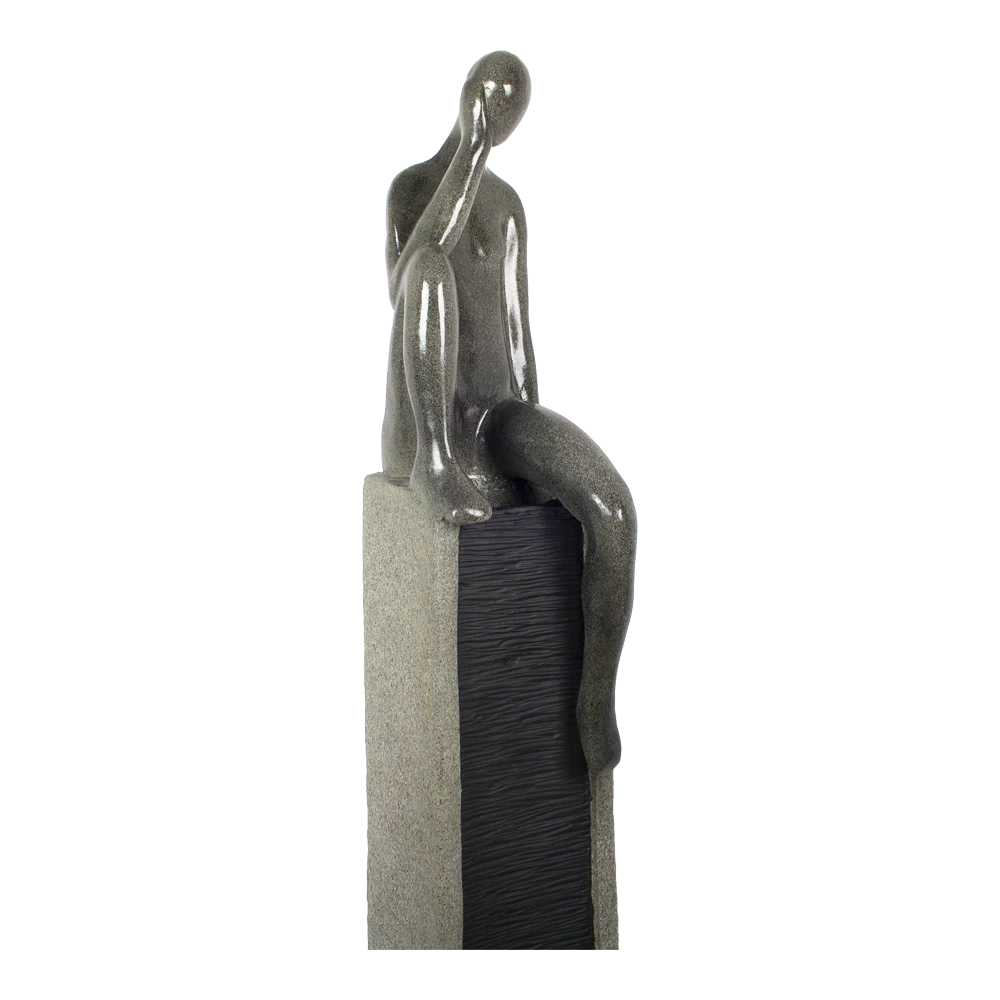 Waterornament Zagreb is een stijlvolle terrasfontein met een hoogte van 151cm. Hij is gemaakt van polystone, hard kunststof, en bestaat uit een stonelook pilaar met daarop een zittend persoon. Het beeld bovenop lijkt op hardsteen met gladde, donkergrijze afwerking. De pilaar is grijs van kleur en heeft een ruwere afwerking. In het midden van de pilaar kabbelt het water naar beneden. Daarnaast zit er zowel aan de boven- als onderzijde een 6-LED bevestigd. Hierdoor geeft het waterornament extra sfeer in de avonduren.